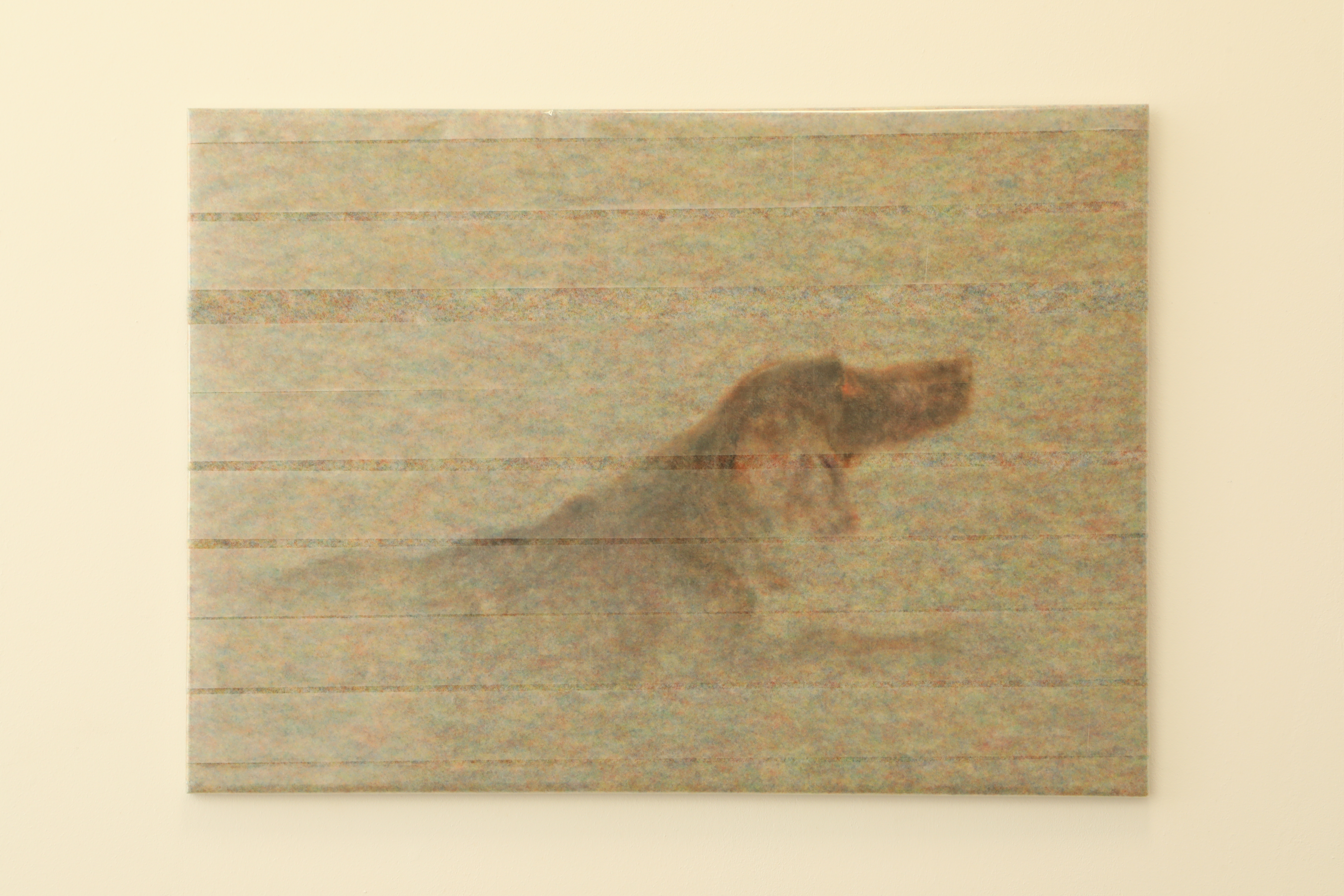 Painted on fabric made from recycled PET bottles, the material evokes a pixelated surface: once clear, once blurred. It can also be seen as speaking of the past, of what has been discarded, and of what may remain. At certain points, transparent tapes run across the surface, adding another formal layer to the picture plane – somewhere between fixation and fragment.